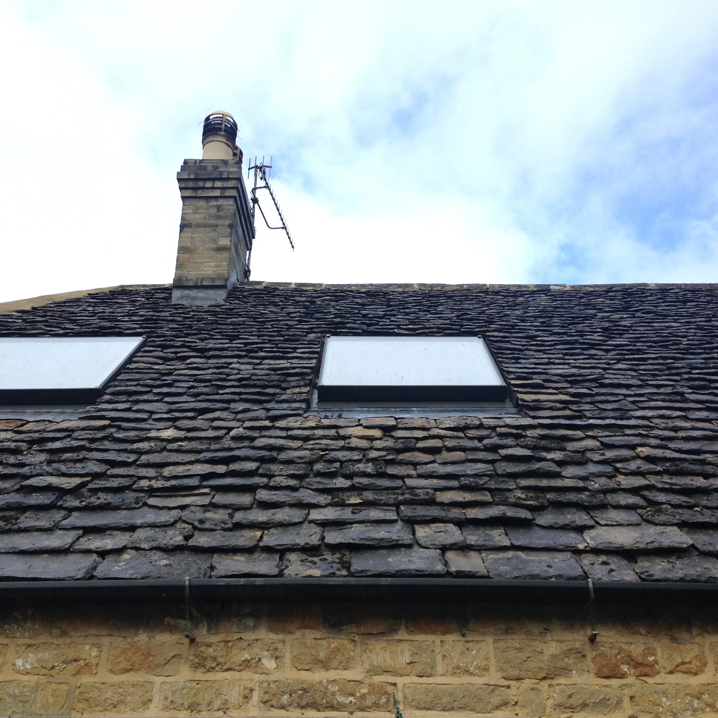 View of completed phase one on stone built property in Chalford, Glos. New roofing, roof windows and joinery.